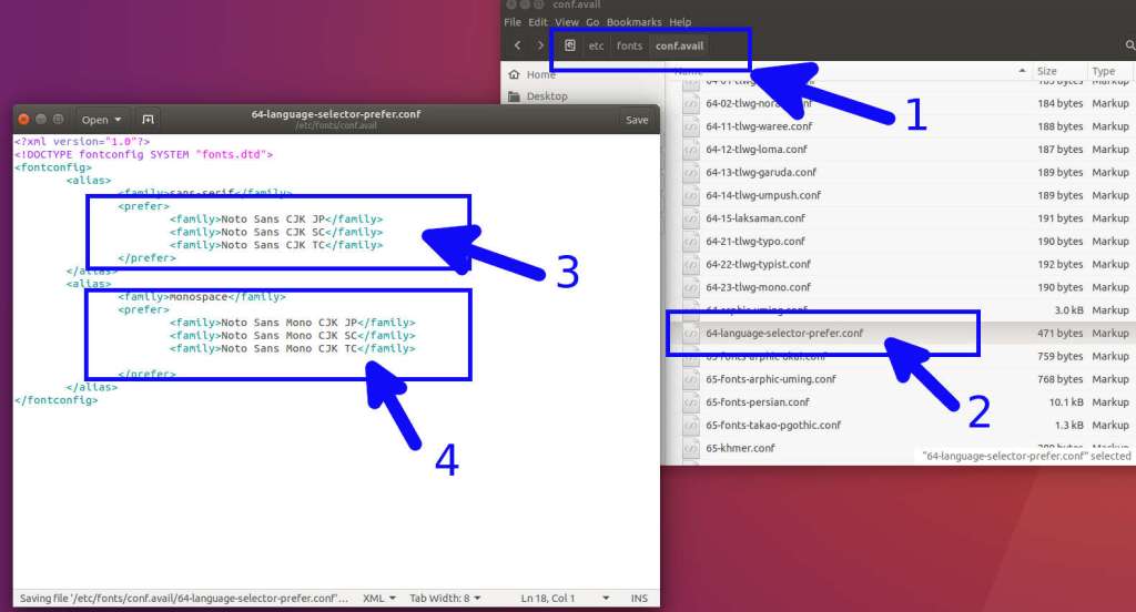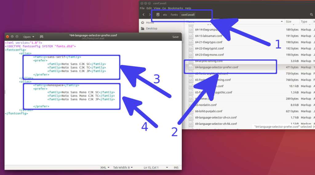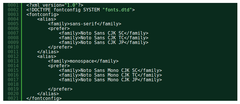 1)用管理员的权限,用文本编辑器打开这个在 /etc/fonts/conf.avail/ 目录下的 64-language-selector-prefer.conf 文件。