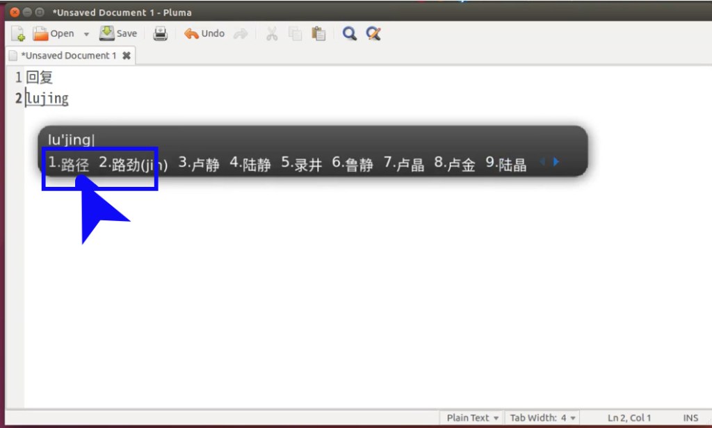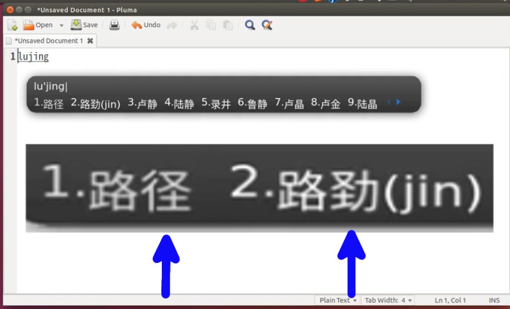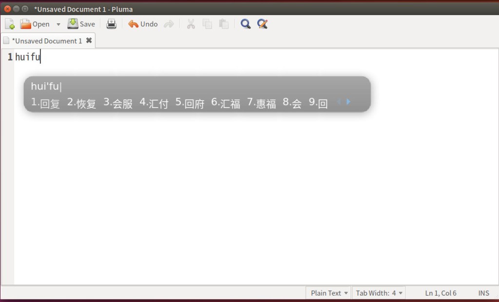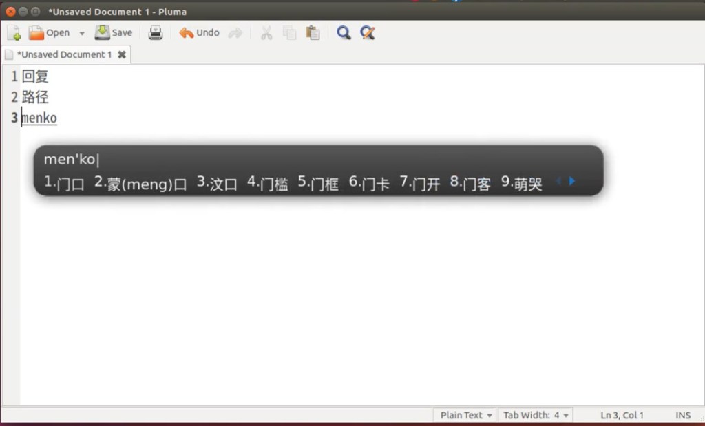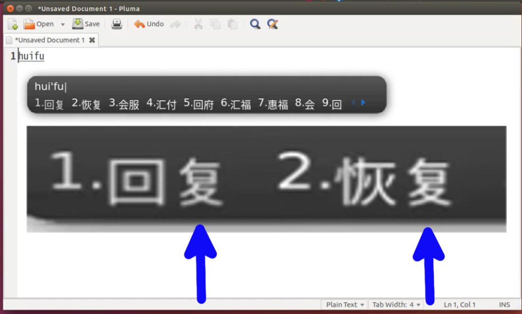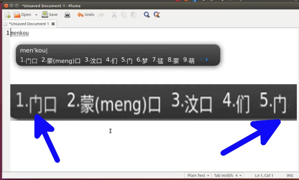 如果您像我一样:安装的是英文的无版图(Ubuntu),然后添加兼容中文的输入支援。在应用的过程中,您一定会发现,在这样的英文界面上,遇到要输入中文时,总有几个汉字在显示上,有些怪怪的……例如:门、复、径等这些汉字。不是显示为半角,就是显示犹如日本字的笔画写法。如下图: